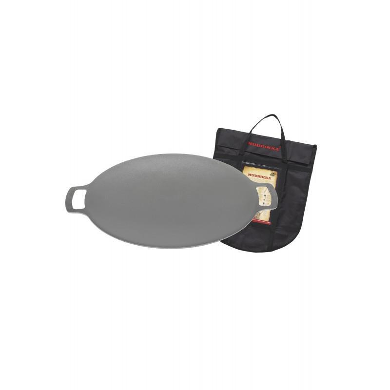Muurikka bålpande på 38 cm med håndtag i begge sider og et cover til at have den i.Panden er lavet i 3 mm valset stål og buer ganske let, for at holde på maden eller stegeolien, hvis du skal bruge det.