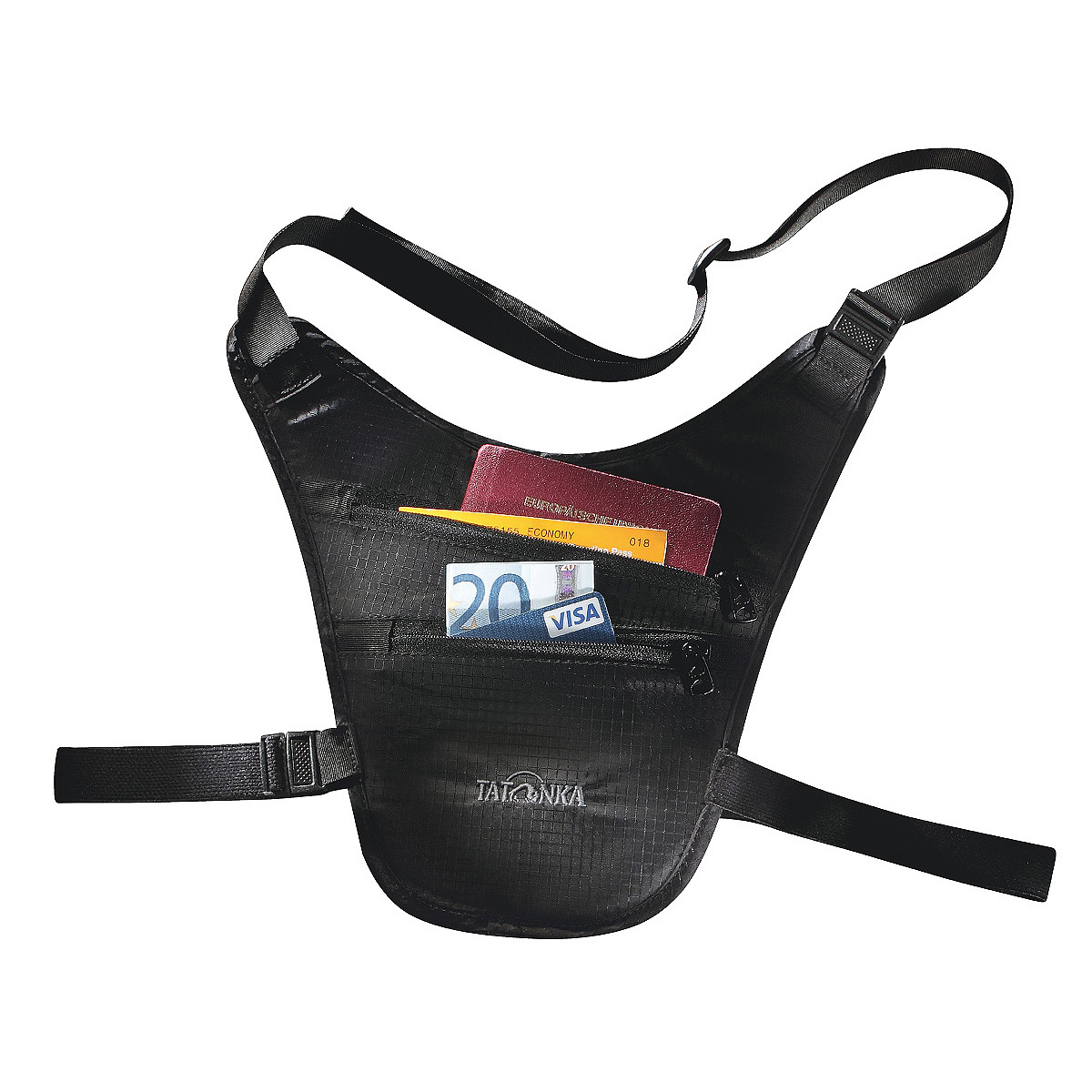 Chest holster fra Tatonka er et pengebælte til brystet. Du har måske set hvordan en pistol bæres i hylster på overkroppen - her kan du sikre dine værdier med samme princip og et hylster der er lavet på samme måde.