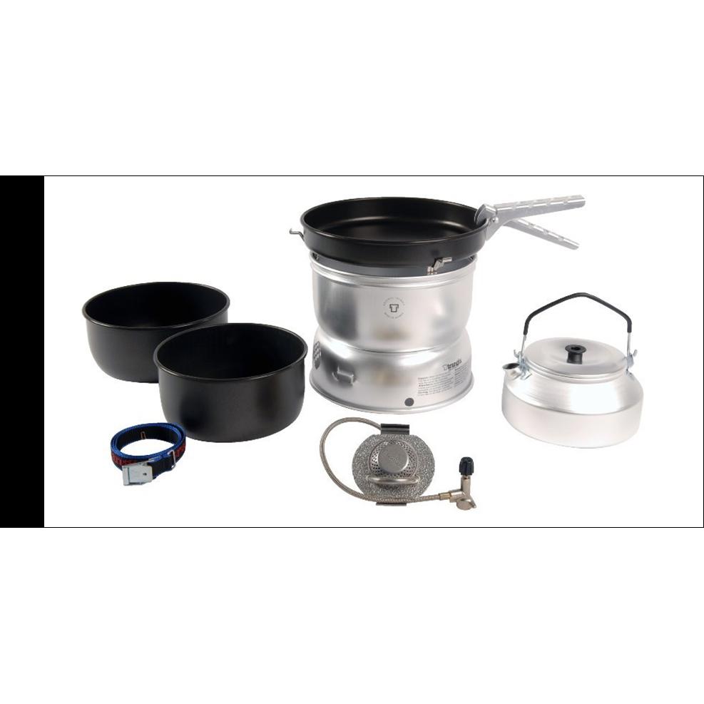 Med et komplet sæt af kogegrej, der inkluderer to kasseroller, en stegepande, en kedel og en håndtag, er Trangia 25-6 stormkøkkenet klar til at tackle ethvert gastronomisk eventyr. De robuste håndtag og låg sikrer nem håndtering og opbevaring af maden, mens den non-stick belægning gør rengøringen til en leg, selv når du er ude i naturen.
